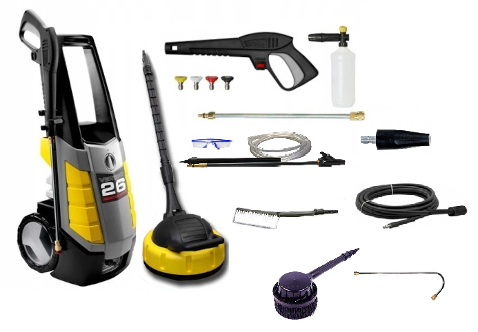 Myjka wyposażona również jest w kółka pokryte gumą jak i wiele uchwytów przeznaczonych do przechowywania elementów myjki. Urządzenie posiada filtr wody, który eliminuje przedostawanie się ciał obcych do pompy co zwiększa żywotność pompy.