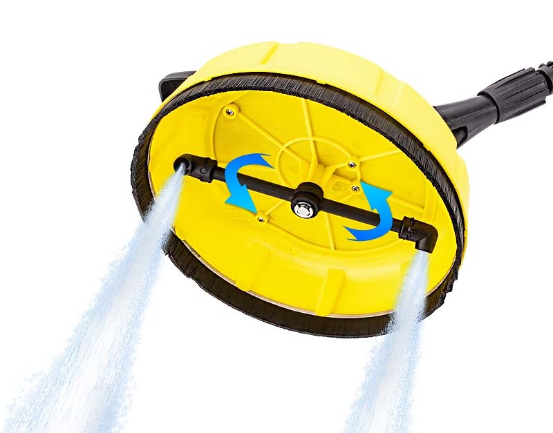 Zintegrowany zbiornik na detergent umożliwia jednoczesne podawanie środka czyszczącego podczas pracy, co znacząco zwiększa skuteczność usuwania zabrudzeń takich jak osady atmosferyczne, błoto, glony czy tłuste plamy. Obrotowe dysze umieszczone pod osłoną zapewniają równomierne czyszczenie powierzchni bez rozchlapywania wody, co poprawia komfort pracy i pozwala uzyskać jednolity efekt czyszczenia.